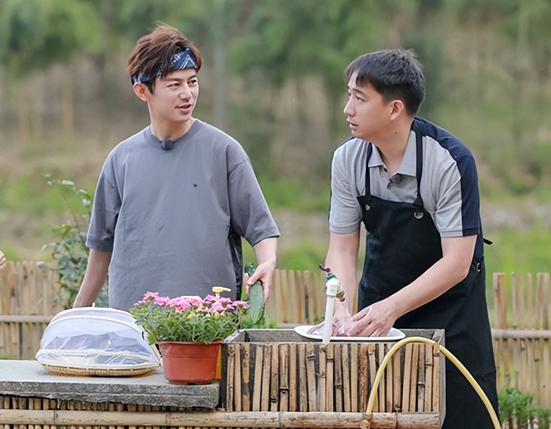 之后四个人来到院子里看花、尬聊,黄磊和何炅针对彭昱畅的身体给出了一大堆建议。