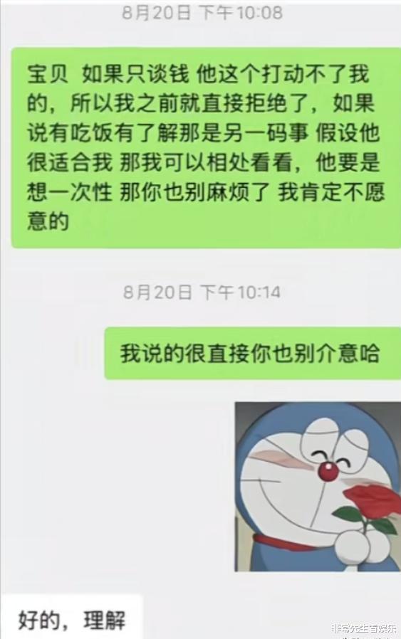 女网红被戳穿后立马怂了,连连道歉,还把自己跟“灰男”的聊天截图发给了王思聪,解释说自己是正经想谈恋爱,不想谈钱搞一次性的。