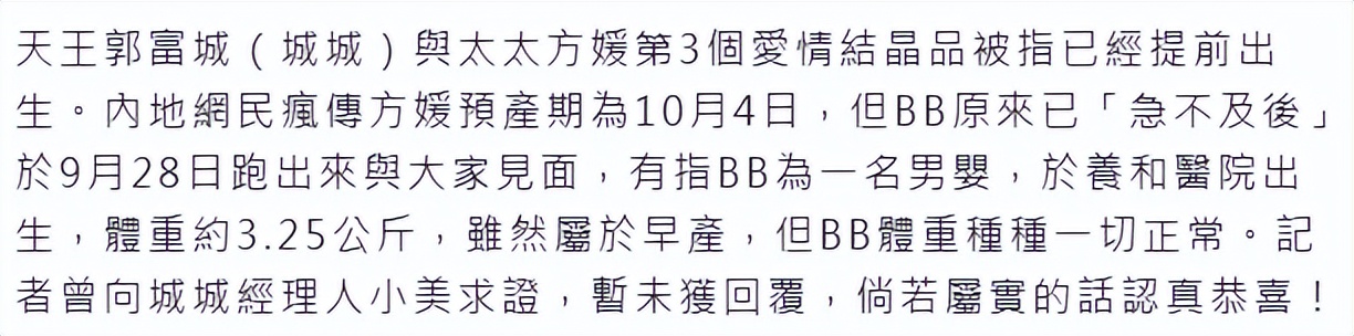 9月30日,港媒爆料方媛已经生下第三胎儿子,母子平安,宝宝体重3.25公斤,虽然是早产但一切正常。