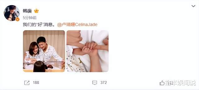 10月24号,韩庚与妻子卢靖姗同时官宣喜讯,并在留言处说到:我们的“好”消息。简单的一句话不仅交代了孩子的性别,同时也让诸多网友感慨,这才是明星艺人,有好事不藏着掖着。