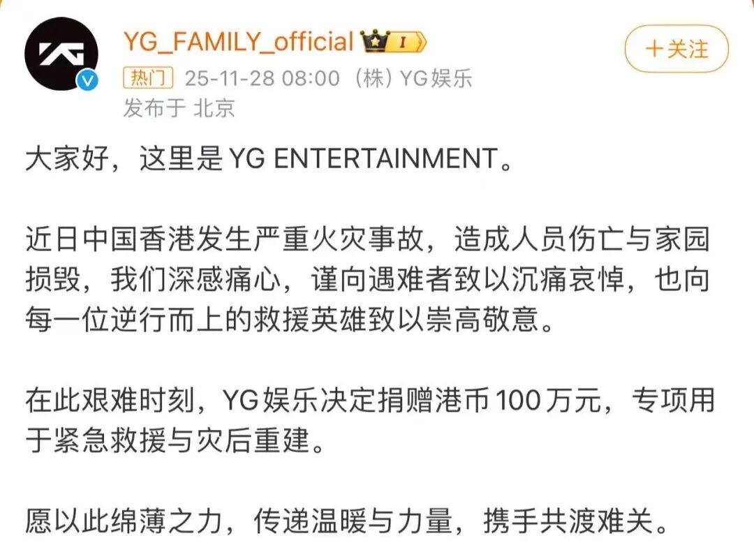 此外,YG娱乐、SM娱乐宣布向中国香港红十字会捐赠100万港元,为灾区救援贡献一份力量。