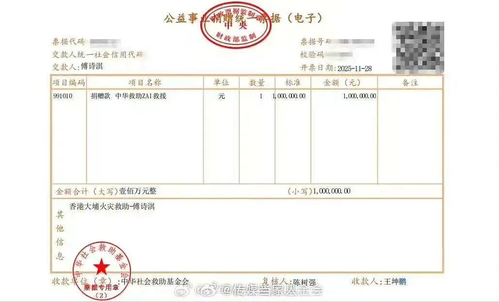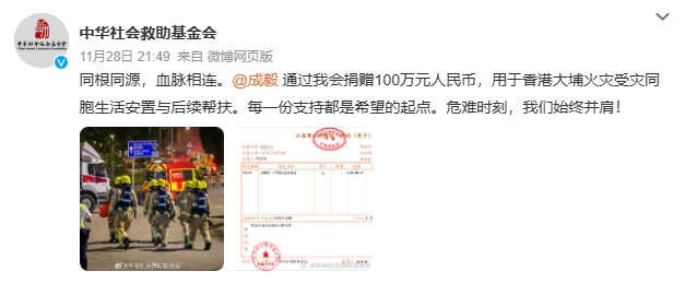 11月28日晚,中华社会救助基金会官方发文确认,成毅通过该机构捐赠100万元人民币,款项专项用于香港大埔火灾受灾同胞的生活安置与后续帮扶。