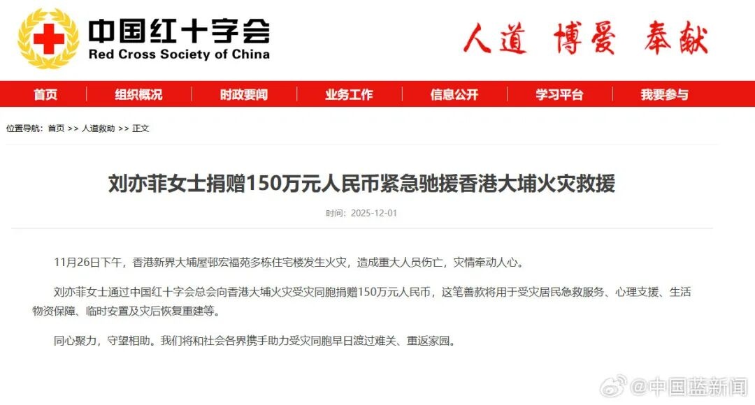 @中国蓝新闻:12月1日,据中国红十字会网站消息,刘亦菲于11月29日通过中国红十字会总会向香港大埔火灾受灾同胞捐赠150万元人民币,这笔善款将用于受灾居民急救服务、心理支援、生活物资保障、临时安置及灾后恢复重建等。