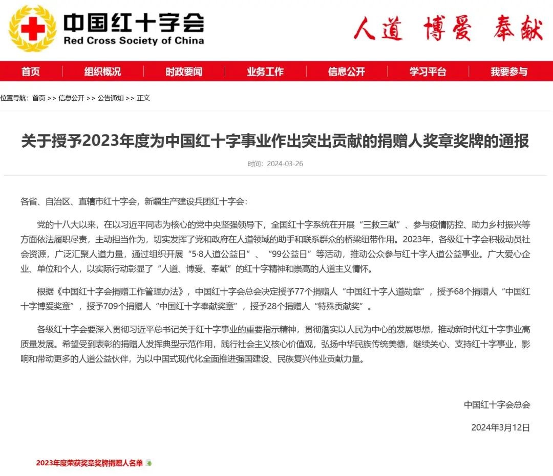 2024年3月26日,中国红十字会官网显示,中国红十字会发布关于授予2023年度为中国红十字事业作出突出贡献的捐赠人奖章奖牌的通报。