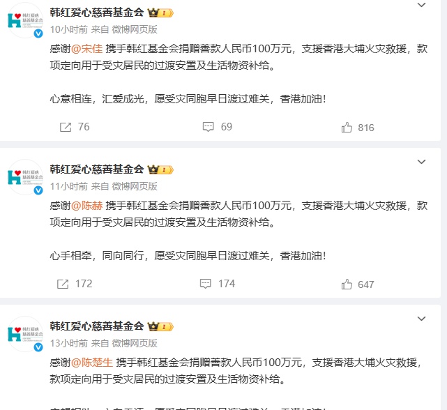 另外,韩红爱心慈善基金会也感谢了宋佳、陈楚生、陈赫等多位明星,携手韩红基金会各捐赠善款人民币100万元,支援香港大埔火灾救援,款项定向用于受灾居民的过渡安置及生活物资补给。