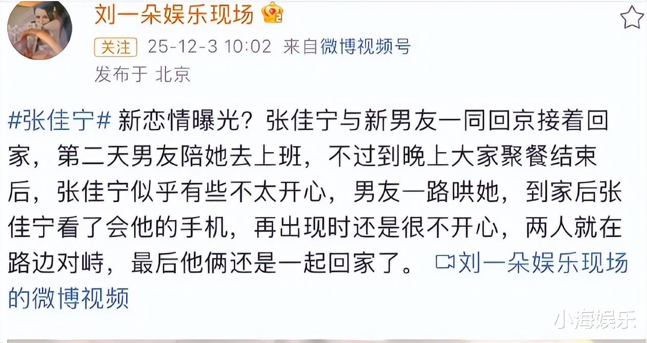 12月3日,狗仔“刘一朵”爆料,演员张佳宁新恋情,并晒出多段视频。视频中张佳宁和男友一开始你侬我侬心情好,没想到晚上就吵架对峙。