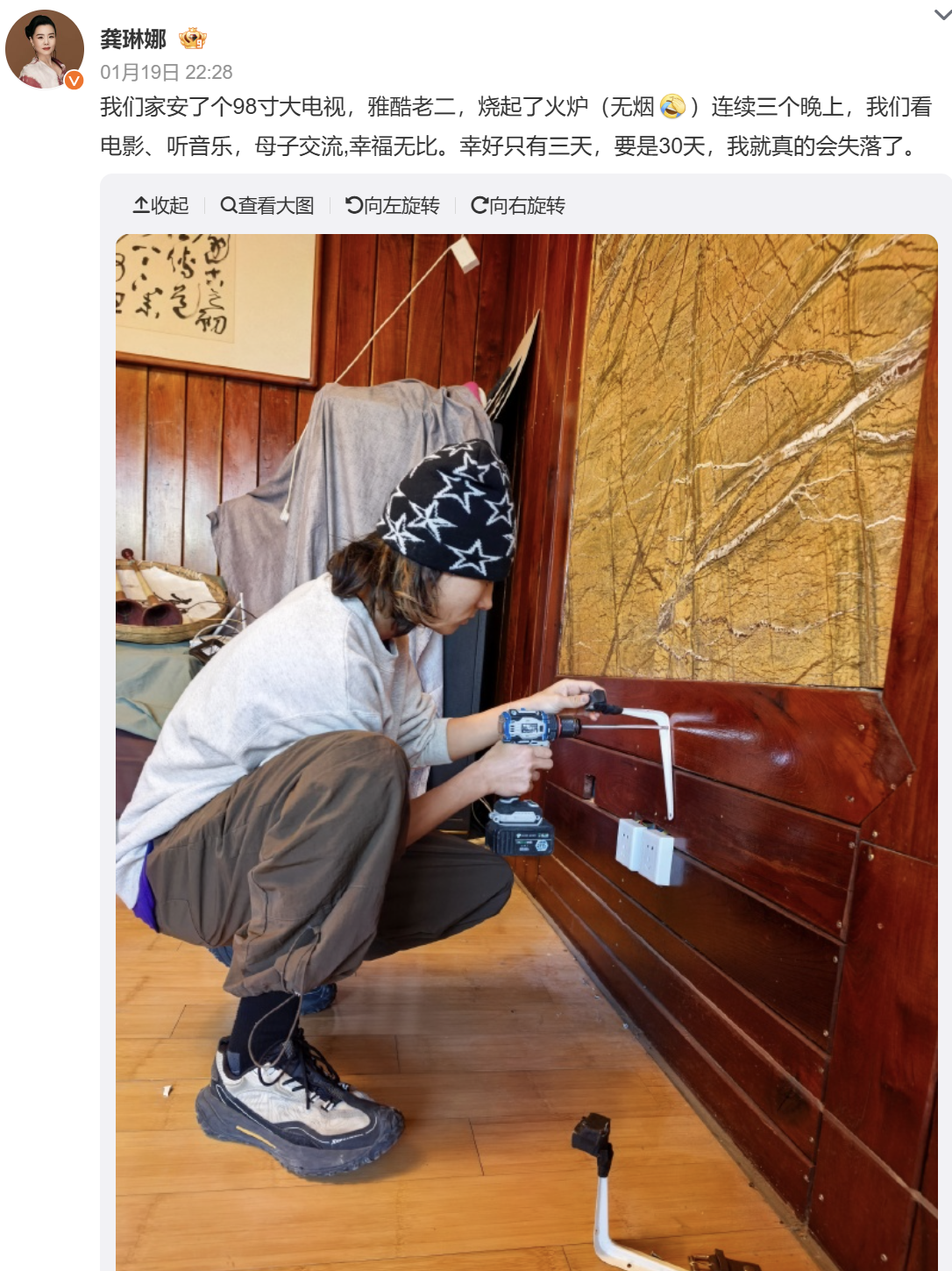 她说家里安了一个98寸的大电视,烧起了无烟火炉,连续三天母子二人窝在家里看电影、听音乐、交流,无比幸福。