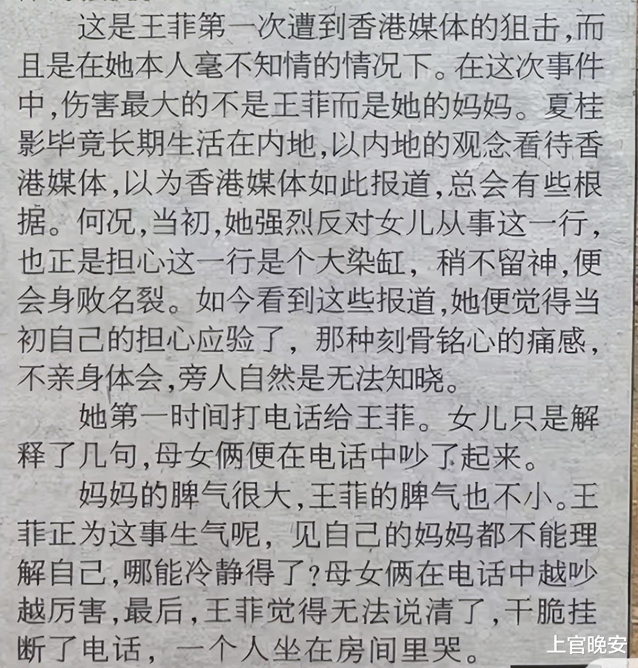 王菲放弃读大学的机会闯荡娱乐圈,夏桂影强烈反对,她认为娱乐圈是个大染缸,稍不留神就会身败名裂。虽然后来的王菲没有身败名裂,但是也确实经常陷入各种舆论中,好的坏的都有,每次王菲被误解、被攻击,最煎熬最痛苦的都是她的母亲。