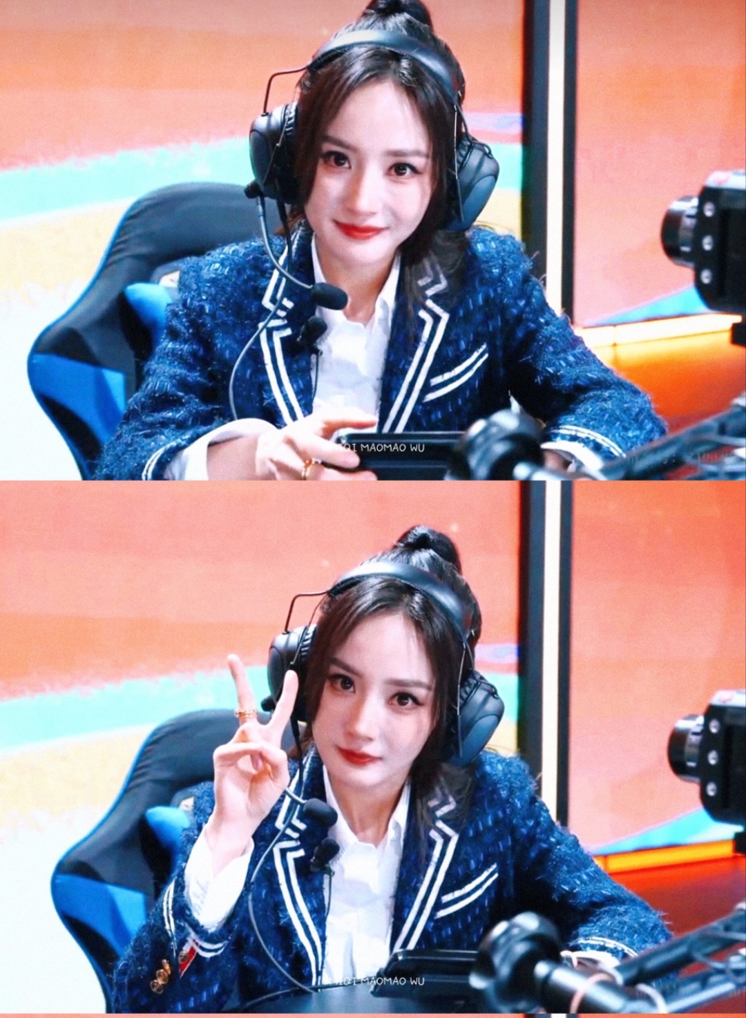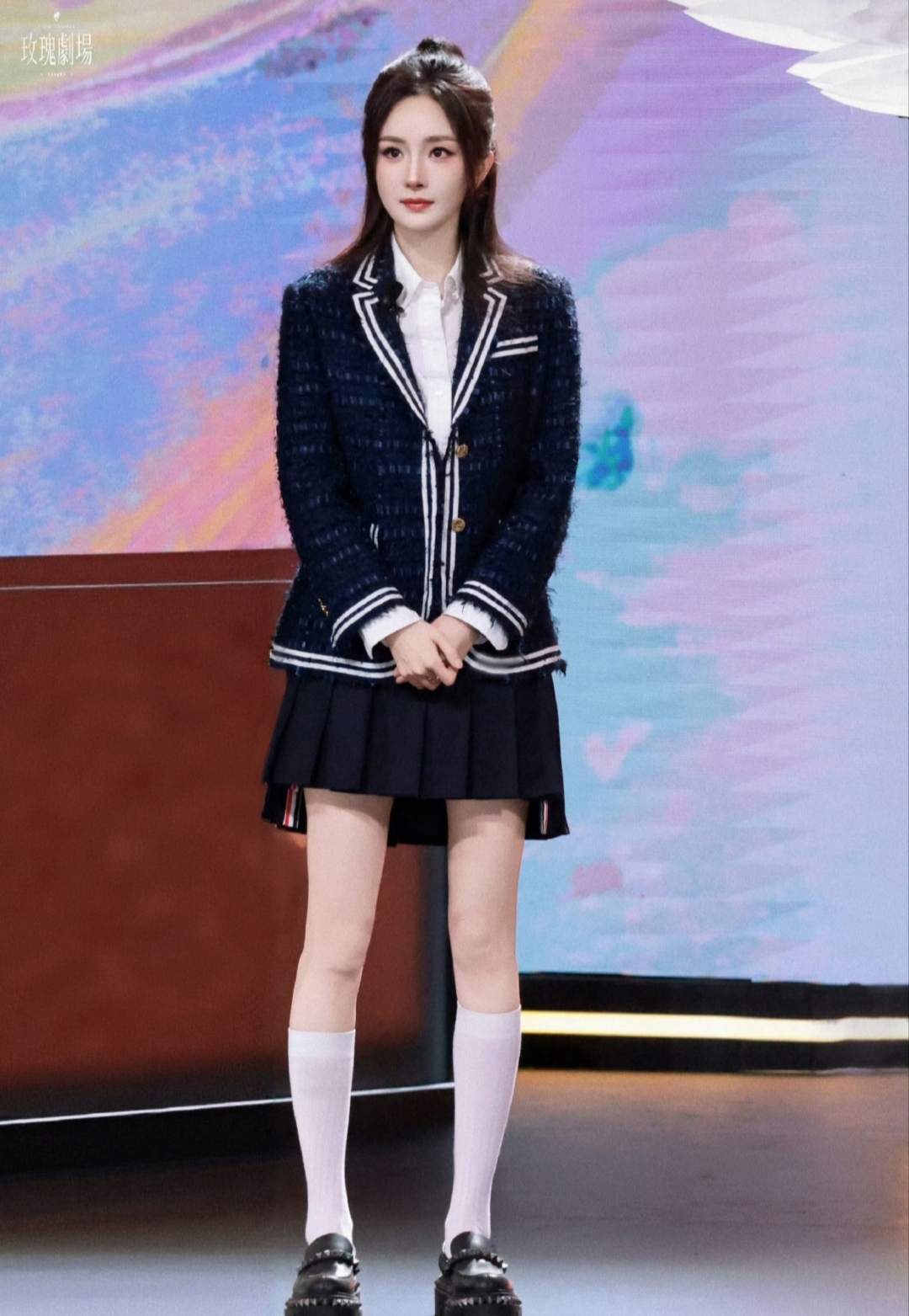 这场现象级走红的导火索,始于杨幂团队对造型的极致打磨。活动当天,她以西装外套搭配百褶短裙,Christian Louboutin乐福鞋与白色高筒袜的组合堪称神来之笔——既保留了学院风的纯粹感,又通过袜口10公分的黄金露肤度拉长腿部线条。发型师透露,双马尾发尾特意系着与战队应援色呼应的湖蓝色丝带,连眉形都调整为低饱和度的野生眉,"要营造出刚结束社团活动、匆忙赶来赛场的真实感"。