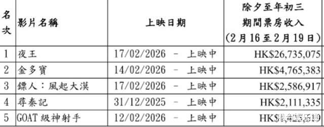 随着当地春节假期的结束,香港、澳门贺岁档最重要的黄金阶段(除夕-大年初三)正式结束,各大近期在映的电影在这场票房争夺战中的表现也陆续出炉。近日,香港票房有限公司公布了这4天的港澳票房数据。