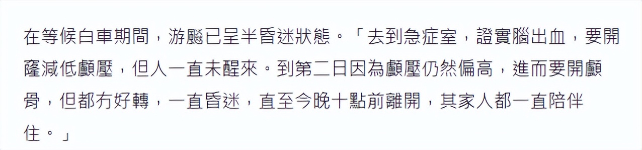 好友黄文标受访证实,他说和游飚在同一家公司上班,2月12日,游飚正在办公室见客户,突然趴在桌子上请求帮助,当被抬上救护车时,游飚已陷入半昏迷,因为脑出血做开颅手术,但一直没有抢救过来,到2月24日深夜去世,家人在病床陪伴。