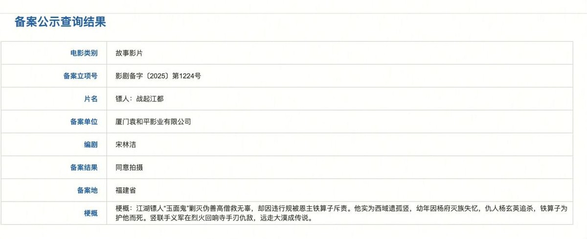 一边是名为《镖人:战起江都》的影片已经完成了备案。