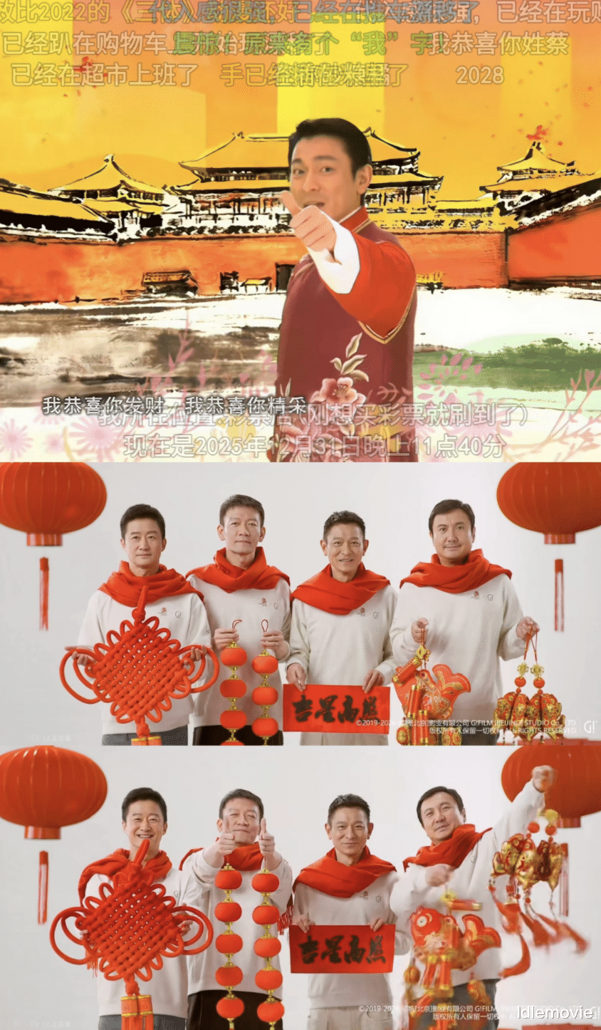 而且吴京、郭帆、刘德华、沈腾在视频前后穿的都是正常服装,只是中间说“恭喜发财”的时候变装成了马褂。