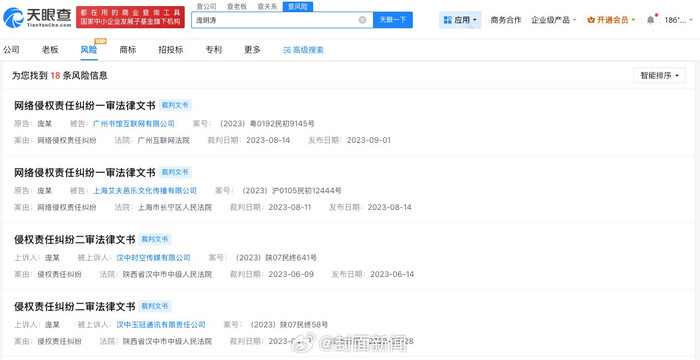 #华晨宇[超话]#[#庞麦郎曾发起维权败诉##华数传媒曾因合同纠纷起诉庞麦郎#]#庞麦郎华晨宇#3月30日,庞麦郎转发李荣浩维权微博并提及华晨宇引关注。天眼查法律诉讼信息显示,此前,庞明涛(庞麦郎)曾多次发起网络侵权责任纠纷、肖像权纠纷等案件,被告涉及多个公司。其中,庞明涛起诉广州书馆互联网有限公司、上海艾夫邑乐文化传播有限公司、汉中时空传媒有限公司等案件,庞明涛撤回上诉。此外,庞明涛起诉汉中玉冠通讯有限责任公司侵权责任纠纷案件中,法院判定原告认为被告侵犯其肖像权无事实和法律依据,其诉讼请求不予支持。值得注意的是,北京华数文化传媒有限公司曾因合同纠纷起诉庞明涛(庞麦郎)。