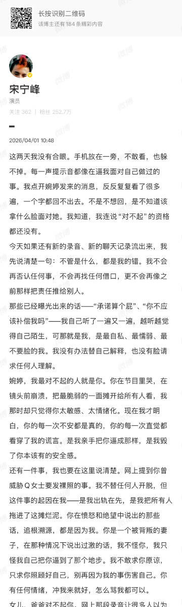 刚刚,被狗仔曝出与出轨对象Q女士录音的演员宋宁峰发布长文,坦言出轨事件属实。在长文中他提到,录音里是“最自私、最懦弱、最不要脸的我”,更称自己最对不起的人是妻子张婉婷,“现在我才明白,你的每一次不安都是真的,你的每一次直觉都看穿了我的谎言,是我亲手把你逼成那样。”