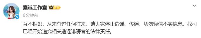 4月9日,@秦岚工作室发声明回应:互不相识,从未有过任何往来,请大家停止造谣、传谣,切勿轻信不实信息。我司已经开始追究相关造谣诽谤者的法律责任。