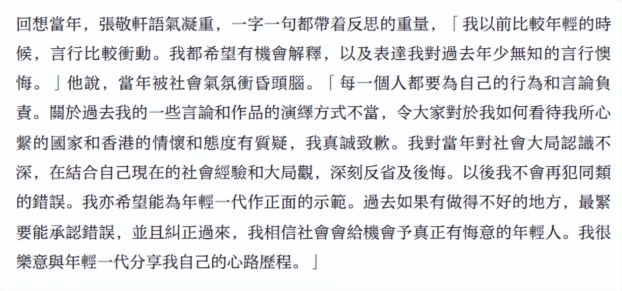 4月11日,张敬轩接受香港文汇报采访,他说担任项目导师不仅是身份转变,更是对过去不当言行的深刻悔改,称当年对香港的批评是因为年轻气盛,对社会大局不够了解,某些作品的演艺方式也出了问题,他接受采访诚恳道歉,将以过来人的身份,带领曾迷失方向的香港年轻人北上交流,见证国家的进步,希望以身作则引导年轻人认清错误,重新出发。