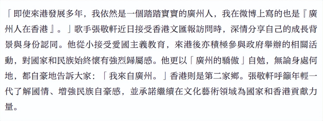 据悉,45岁的张敬轩是广州人,2002年到香港发展,他在2012年到2015年期间,多次发表不当言论,2017年返回内地参加《我是歌手》,因被抵制而退赛,当时官媒直接点名批评,张敬轩则透过微博否认自己是港独,但网友并不买账。