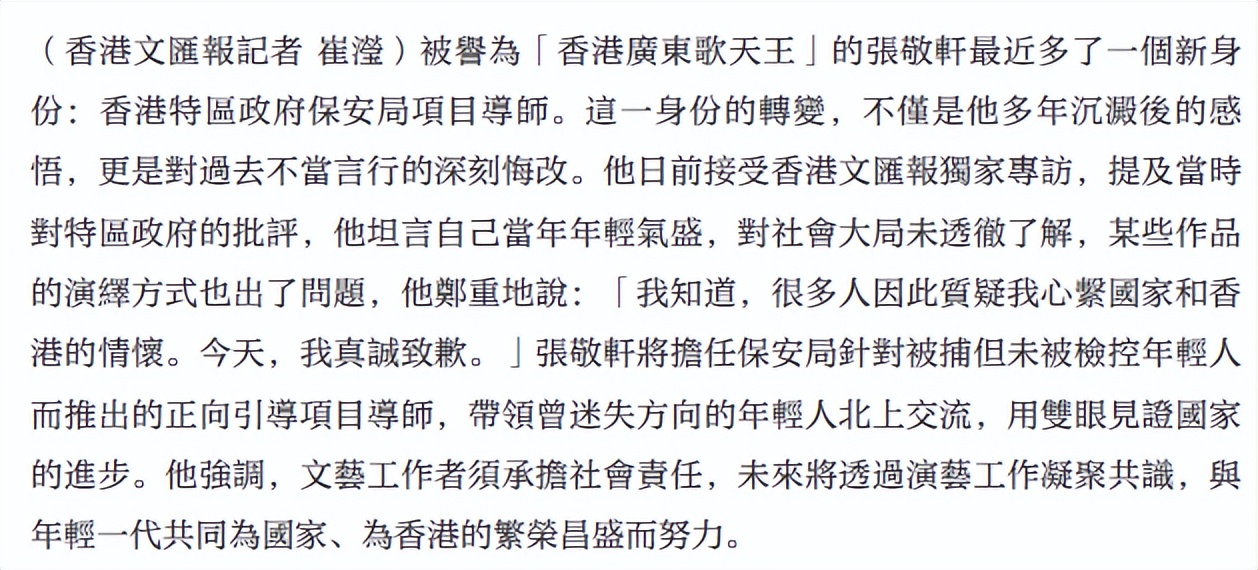 在香港发展24年的歌手张敬轩,首次就过去的言论道歉,接受香港保安局的委任,担任“正向引导”的项目导师,计划上半年带团到内地交流,让香港年轻人见识国家繁荣。