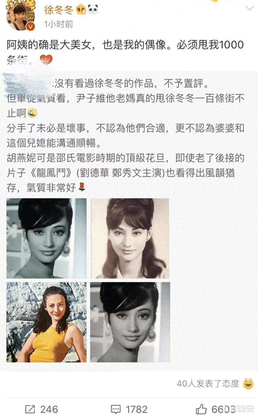 看了胡燕妮的旧照是不是就能理解网友拉踩她的儿媳妇徐冬冬:胡燕妮甩徐冬冬100条街。