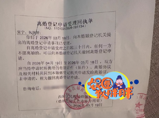 据悉,这份回执单细节清晰,明确显示宋宁峰(本名宋宁)与张婉婷于2026年3月19日,共同向西城区民政局婚姻登记处提交离婚申请,当日便获得官方受理,回执单号、受理日期、登记机关公章等信息一应俱全,可信度拉满。按照我国离婚登记流程,自收到回执单之日起,双方将进入30天冷静期,截至4月19日冷静期已届满,接下来一个月内,两人若共同到场即可领取离婚证,若一方缺席则视为撤回申请。