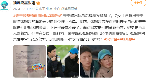 4月22日,娱乐圈再掀波澜,Q女士再度发声,晒出宋宁峰与张婉婷的离婚登记申请受理回执单,这份盖有官方公章的文件,彻底坐实两人正走离婚程序的传闻,也让这场持续一个多月的狗血风波,迎来了新的关键节点。