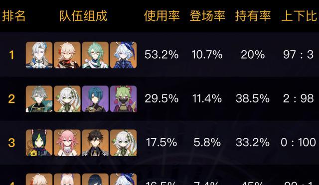 然后再来看一下队伍情况,其中排名第一的就是那维莱特,芙宁娜,万叶和白术这支队伍。在芙宁娜未上线前,已经有人表示最适配的队伍就是“白万芙特”,所以很多人在此之前就已经开始准备了。更没想到白术能够借此之光,荣登榜首之位。其他的老牌组队被新队伍略压一头,毕竟是枫丹人权卡,他们不强谁强呢。