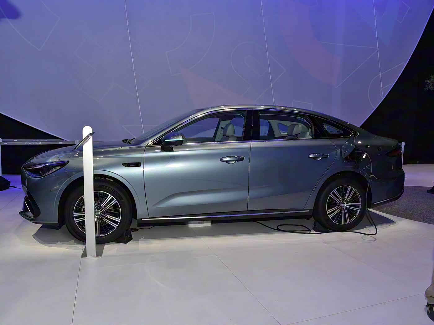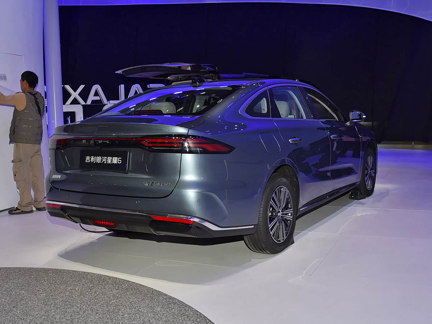 再来看车尾部分,车尾设计以 “旭日东升” 为灵感,贯穿式尾灯组由多颗灯珠组成,如同晨光破晓的动态画面。尾灯下方的 “GALAXY” 英文标识采用熏黑处理,与车尾整体风格统一。后保险杠采用双色设计,上半部分与车身同色,下半部分黑色包围嵌入银色饰条,配合隐藏式排气布局,让车尾更显整洁大气。底部扩散器造型虽为装饰,但优化了空气动力学表现,同时增强运动氛围。高位刹车灯集成在扰流板末端,与尾灯形成呼应,提升行车安全性。整体而言,车尾设计既延续了车头的东方美学基因,又通过动态灯光与简洁线条,实现了家用沉稳与运动格调的平衡。