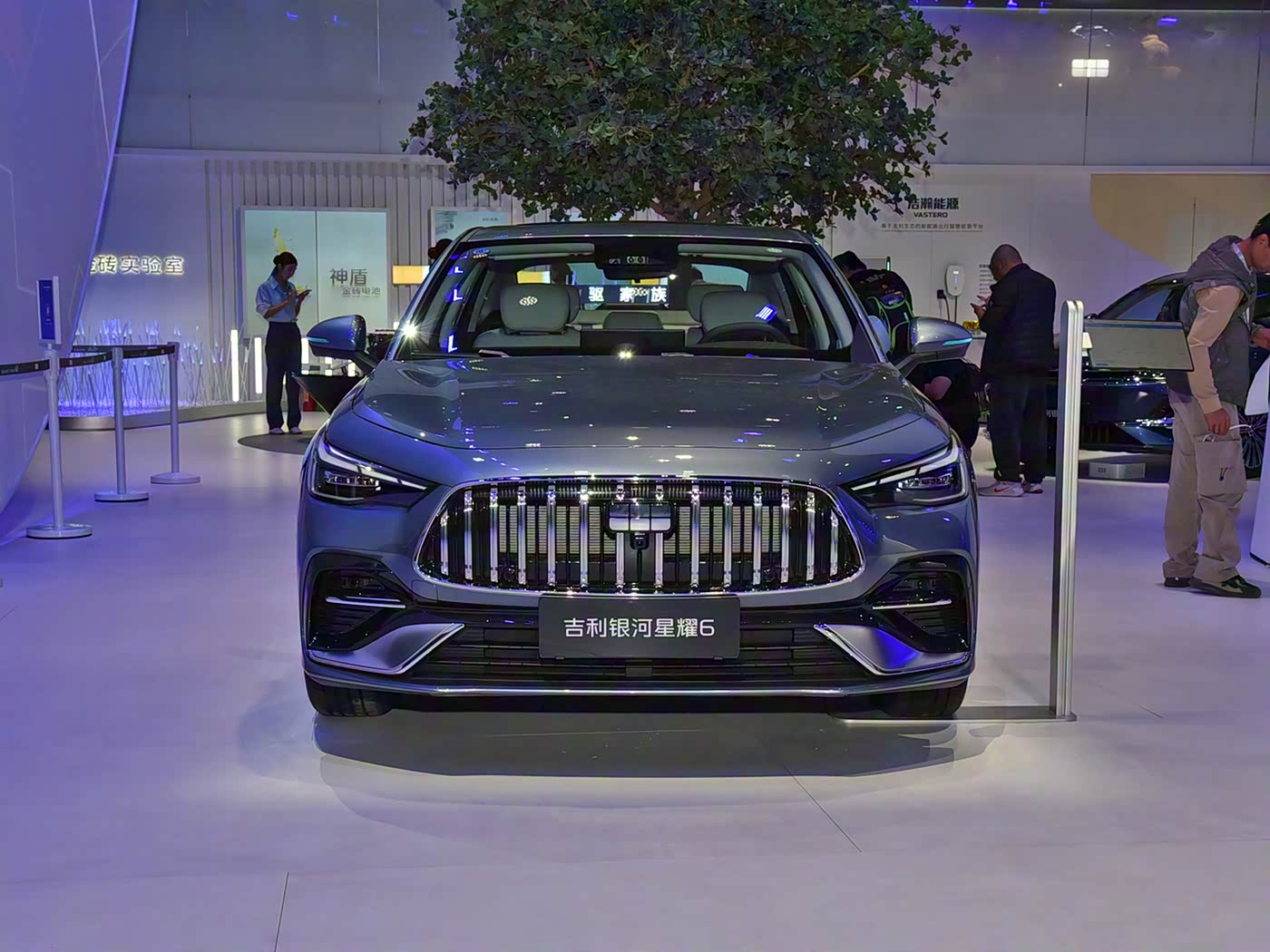 我们首先来看新车的外观设计方面,星耀 6 的车头设计打破了同级 “极简同质化” 困局,以拟人化布局诠释中式美学。前脸采用 “上庭、中庭、下庭” 的三段式结构,传承传统建筑对称精髓。中央 “银河星瀑” 格栅由 29 道星瀑造型饰条构成,49 道飞船飞檐线条与大灯衔接,既延续吉利水滴涟漪基因,又注入现代动感。两侧 “飞檐虎视” 大灯是点睛之笔,30 微米纹理雕刻的灯组如同古建筑雕花,钻石包镶 LED 光源的照明范围可达 25.3 米,夜间点亮时兼具威仪感与安全性。前保险杠的三段式进气口采用熏黑处理,两侧导流槽搭配底部银色护板,在强化空气动力学性能的同时,为家用定位注入跨界气息。“沁釉蓝”“丝锦银” 等五种车漆采用 BASF 一线漆料,55μm 加厚清漆膜让车身在光线下呈现 “湖水凝翠” 的细腻质感,远超同级单调配色。