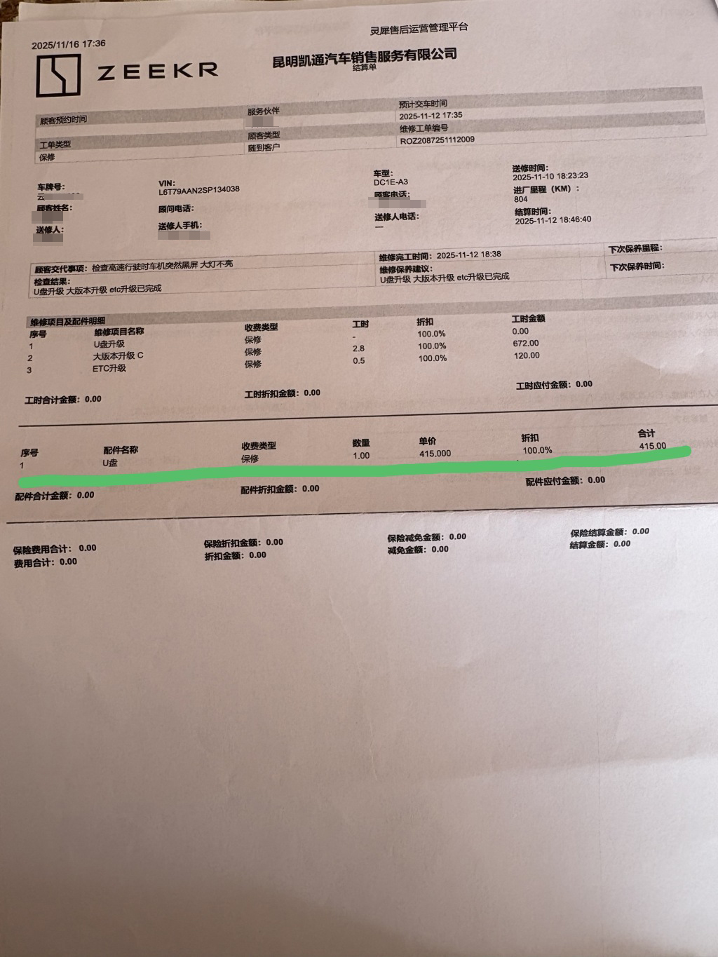 11月10日,周女士与极氪官方客服联系保修,对方将报修派至离周女士家较近的极氪家昆明广福路门店,门店安排代驾将车辆接回检修。隔天,门店告知周女士,车辆需进行大版本系统升级,要求她提供验证码。