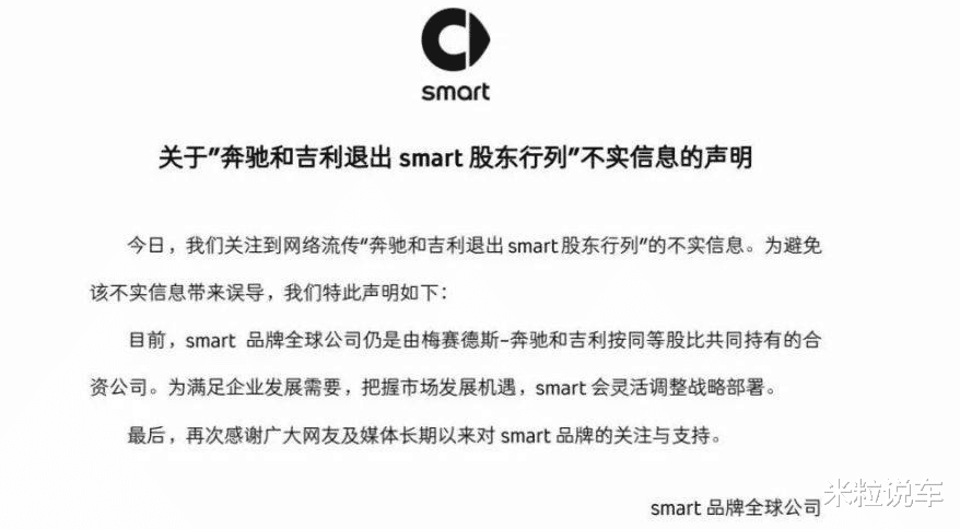 之前发表过一篇文章,其中写到这么一句话:奔驰smart发布了一款新车型!结果一些网友表示,现在的smart中国品牌已经由吉利独资了,属于一家不折不扣的中国品牌。事实上,smart中国早在前两年就辟谣过,smart汽车品牌依然是由奔驰与吉利持股共同持有的合资品牌,为了在中国表现更好,更快,所以smart在中国有着更加快速的决策权。目前,吉利与奔驰持股各占50%,所以smart汽车品牌依然是两家车企合资的。