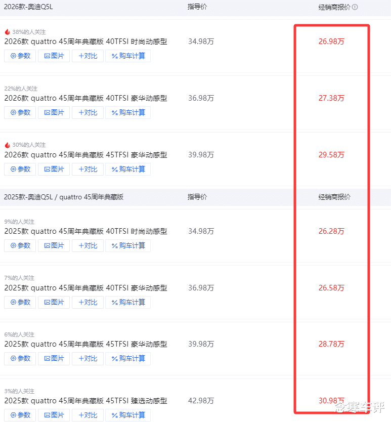 但车友们别忘了,老款Q5L在终端可是有着巨额优惠的,裸车经常干到26、27万。