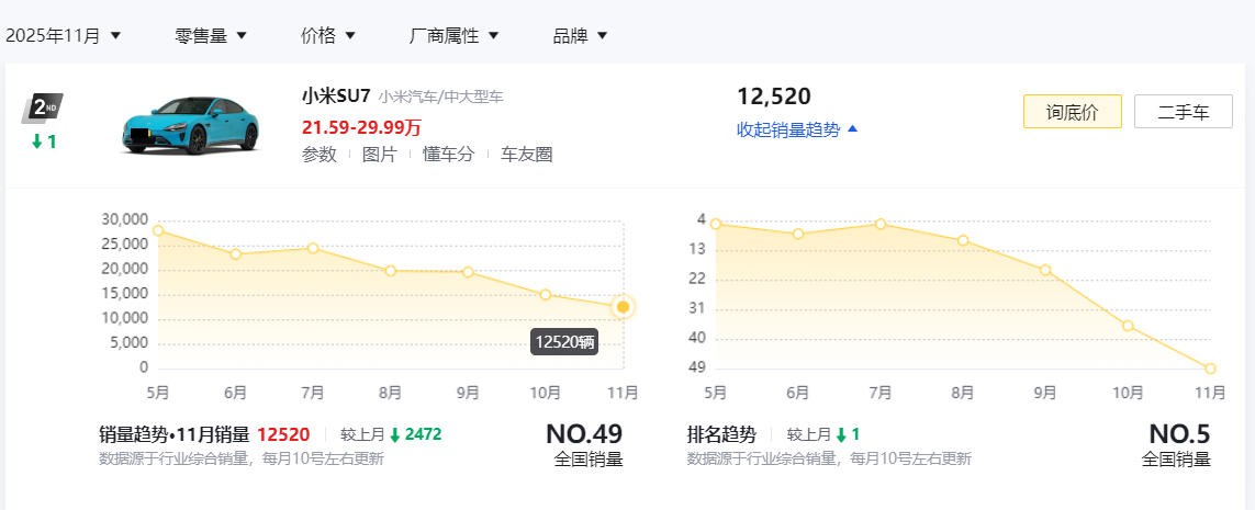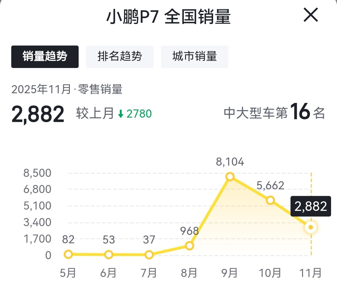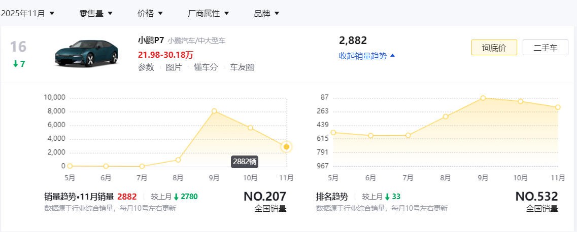 大家或许都没有发现,今年8月27日才正式上市的全新一代小鹏P7,居然已经在10月、11月连续两个月出现销量下滑了。要知道,这款车在9月份可是售出去了8104辆新车,但在10月和11月份,却分别只取得了5662辆和2882辆新车的销量成绩单。那至此也就不禁让我们想要问:全新小鹏P7这是又要卖不动了吗?