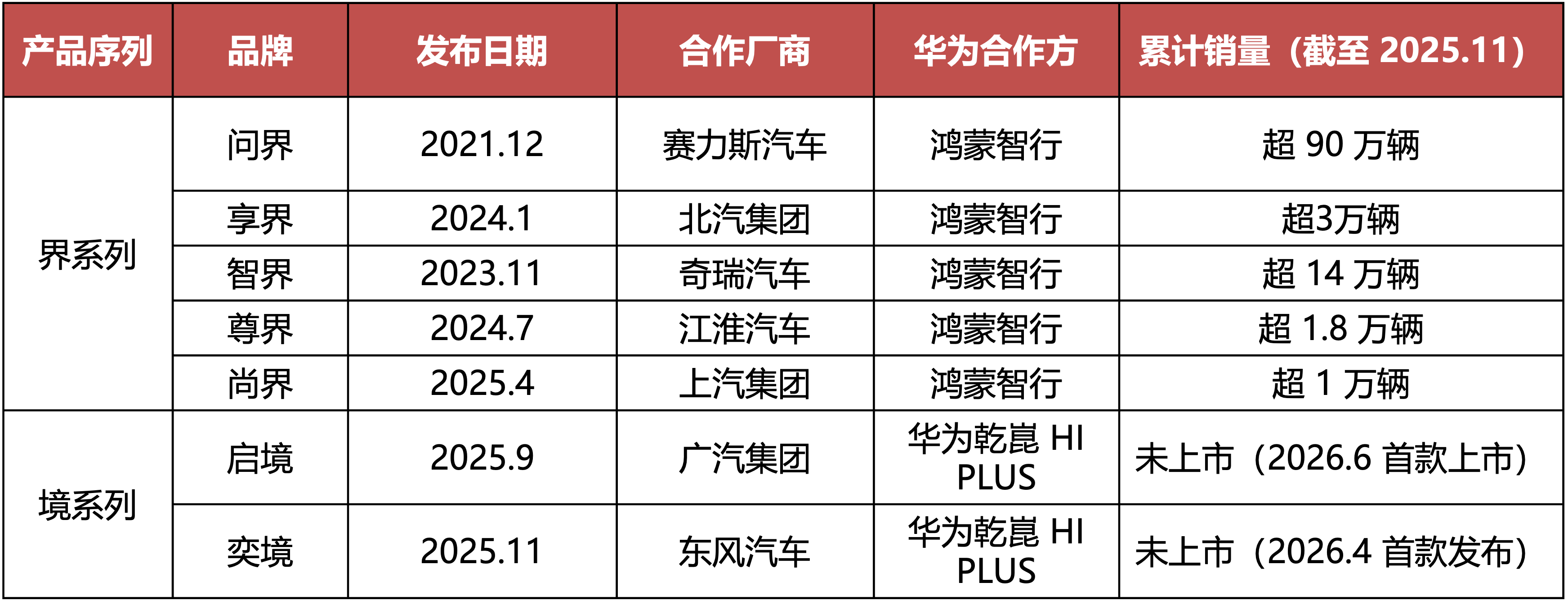 其中,鸿蒙智行模式为“五界”品牌所采用,是HI模式的升级版,也是目前华为参与度最高的合作方式。华为深度介入产品定义、设计研发与渠道销售,与合作车企形成“联合创业”的共生关系。截至2025年11月20日,鸿蒙智行全系车型累计交付量突破100万辆。