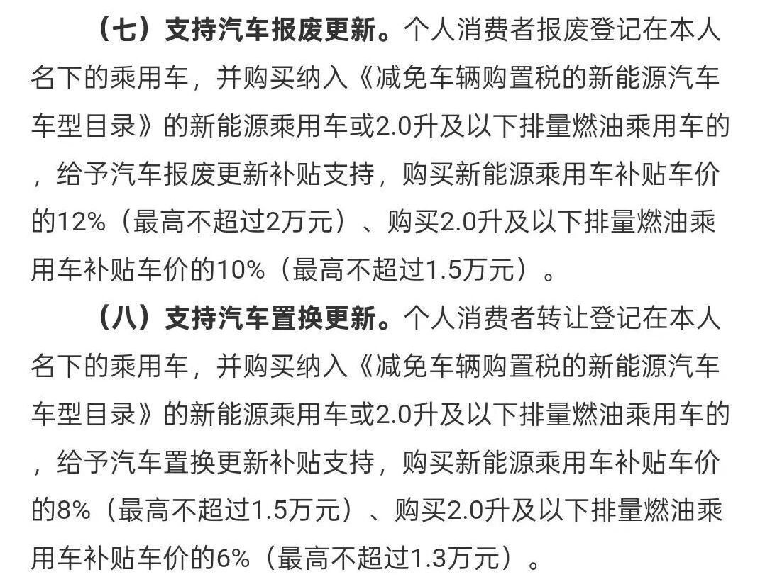 报废更新:个人消费者报废旧车后,购买新能源乘用车可补贴车价的12%,最高不超过2万元;购买2.0升及以下排量燃油乘用车可补贴车价的10%,最高不超过1.5万元。