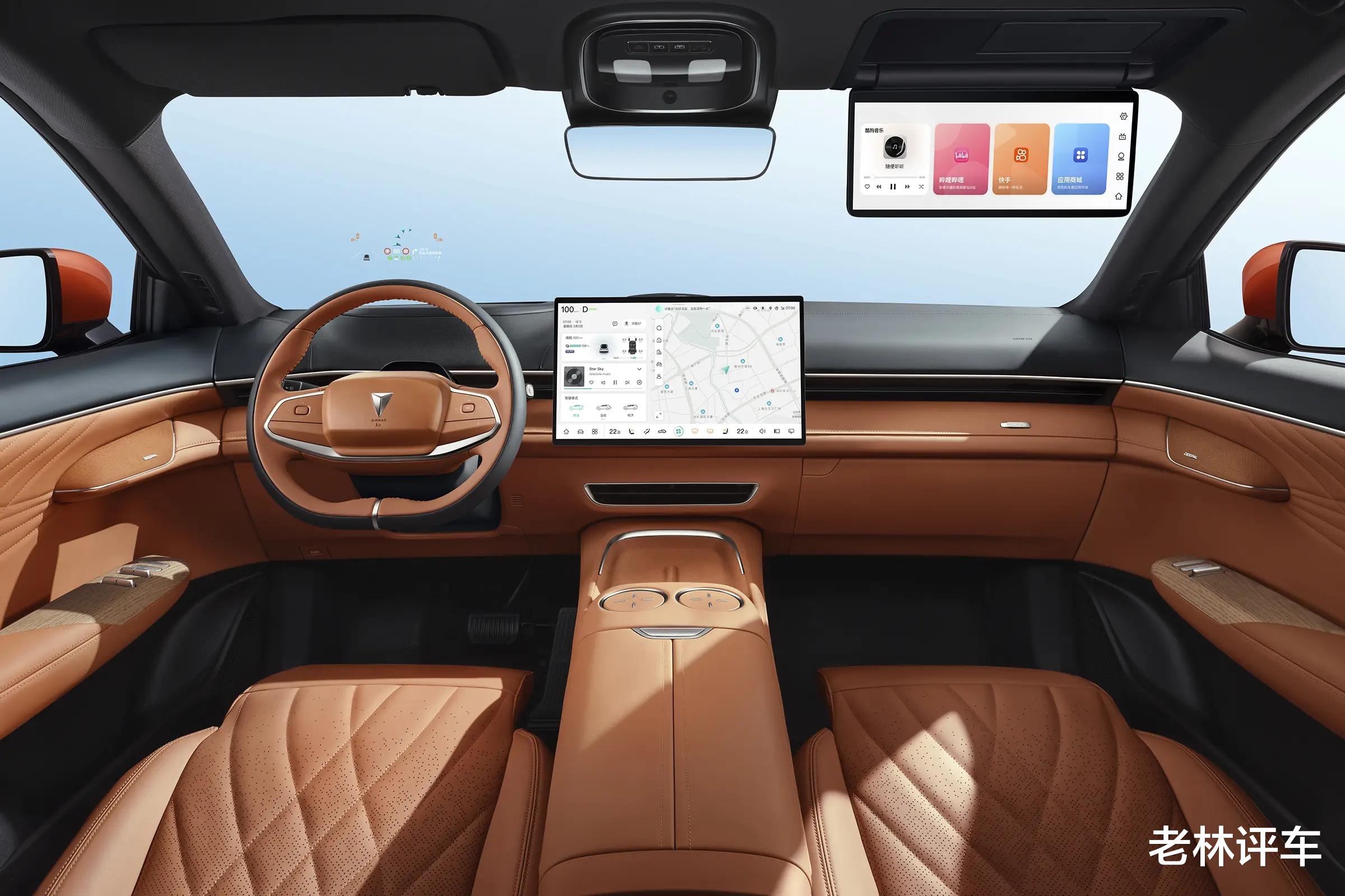 第五,内饰方面,该车配备了15.6英寸2.5K中控屏幕,没有配备仪表盘,而是通过55英寸AR-HUD投屏取而代之,投屏信息十分丰富,可以把AR实景导航、高德地图、时速、电量等信息映射到前挡风玻璃上。另外,在副驾驶的化妆镜位置,还配备了一块12.3英寸的娱乐屏幕。
