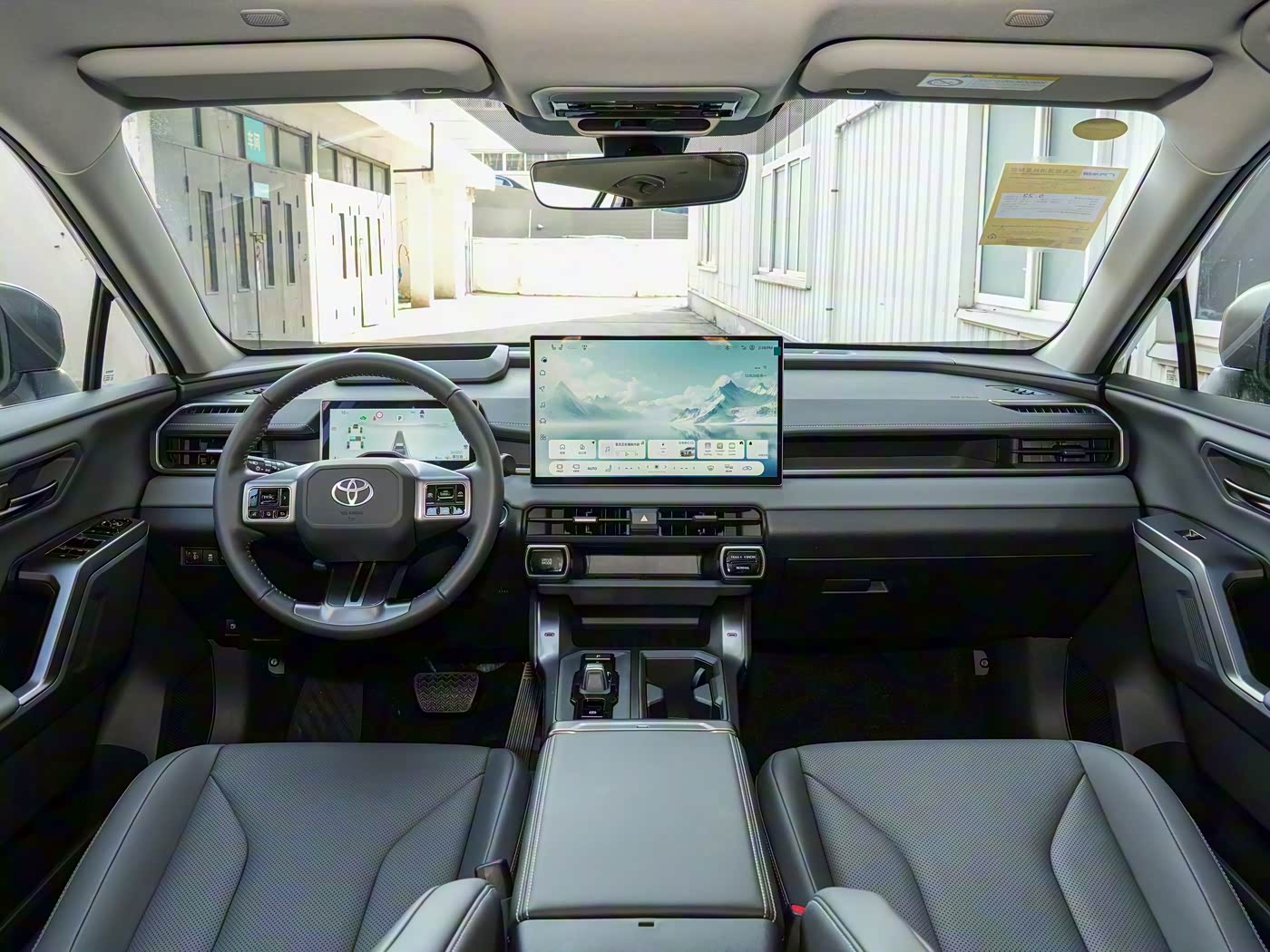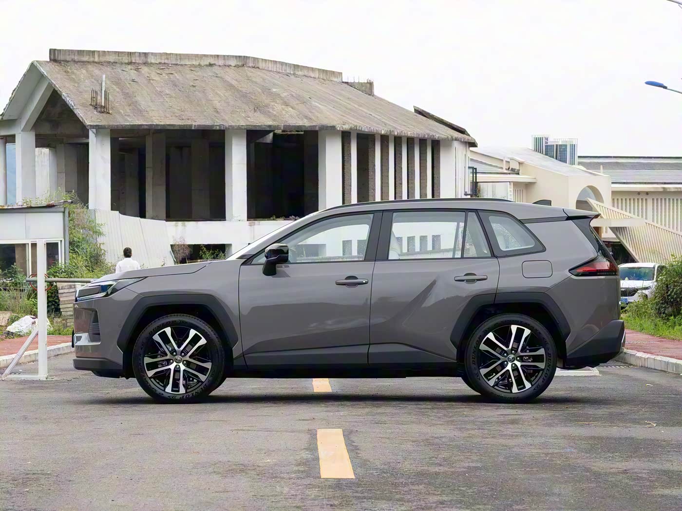 再来看车身侧面部分,车身尺寸为4600mm×1855mm×1680mm,轴距2690mm,经典SUV比例带来协调的视觉感受。侧身线条借鉴电动陆巡的硬朗风格,凹凸曲面车门与外扩轮拱勾勒出饱满肌肉感,车轮与车身高度比约0.43,整车姿态稳健扎实。18英寸熏黑轮毂搭配235/60 R18轮胎,厚胎壁设计增强滤震性,降低爆胎风险,兼顾美观与实用性。外后视镜支持电动调节、加热和自动折叠功能,雨雪天气可快速清除镜面雾气,窄路停车时避免刮蹭,细节设计体现丰田对用户需求的洞察。