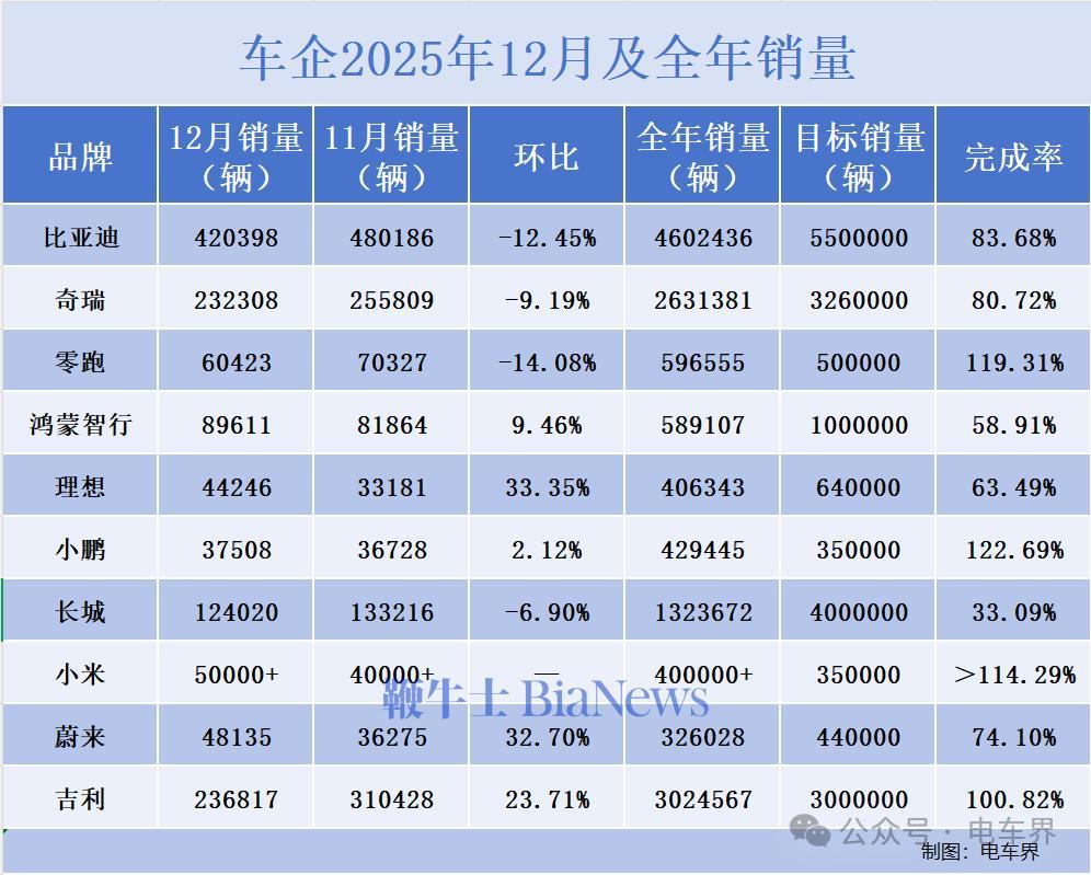 2025年车市收官之战落下帷幕,各品牌12月及全年销量数据相继出炉,不同梯队车企呈现出明显的表现分化,电车界统计部分车企数据如下: