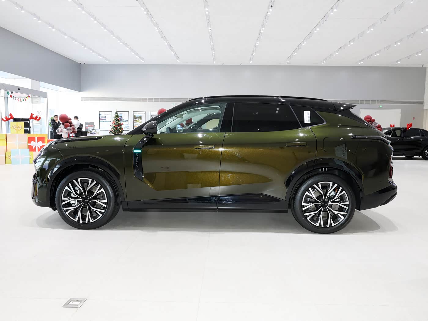 再来看车身侧面部分,4825×1915×1660mm的车身尺寸营造出修长而饱满的视觉效果。侧窗采用无框设计,搭配隐藏式门把手,风阻系数降低明显。悬浮式车顶通过双色车身设计实现,C柱位置的"能量晶体"装饰件成为品牌标志性元素。20英寸"星尘"轮毂采用空气动力学设计,既保证视觉效果又优化了能耗。车身腰线从前翼子板贯穿至尾灯,在光影下形成独特的曲面变化。后视镜创新性地集成在A柱位置,不仅减少风噪,还提供了更广阔的视野。