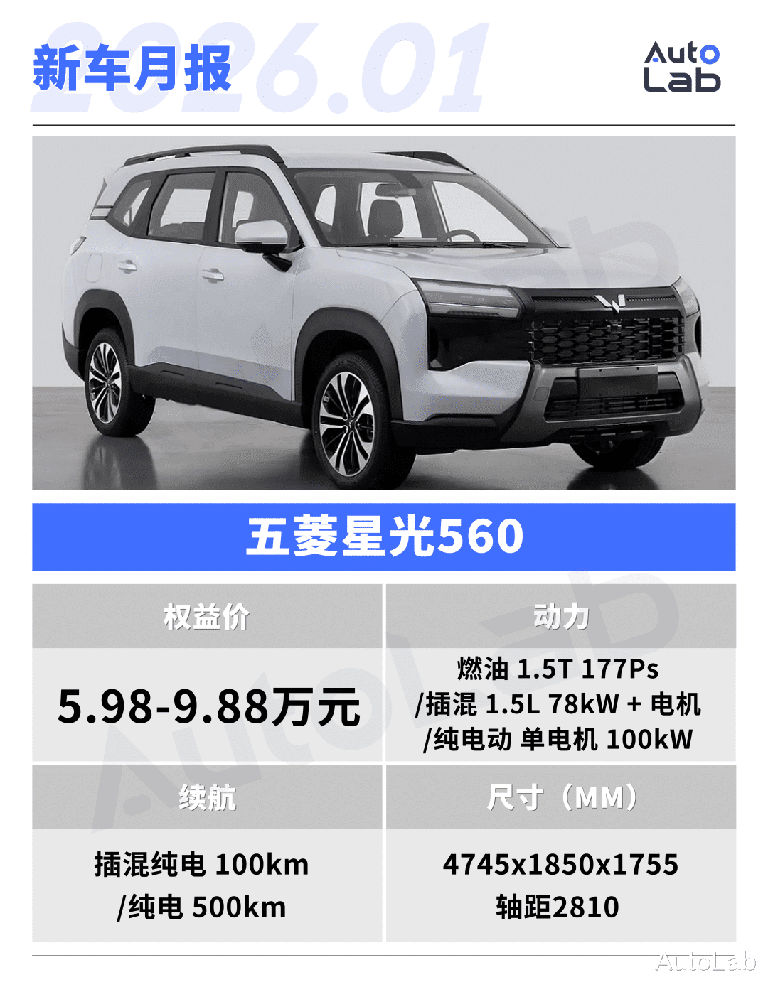 五菱星光560定位紧凑型SUV,整体采用偏硬派的风格设计,一口气提供了燃油、纯电、插混三种动力形式可选。