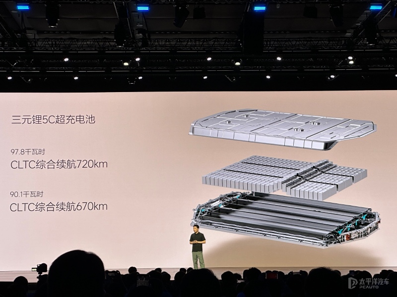 续航方面,新车提供容量为90.1千瓦时和97.8千瓦时三元锂电池组可选,对应CLTC续航里程分别为670km和720km,支持5C充电倍率,10分钟最大增加500公里的续航里程。