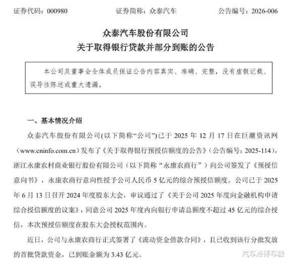 2026年初,众泰与浙江永康农村商业银行签署的《流动资金借款合同》正式落地,首批3.43亿元复产贷款到账。这笔钱年利率只有2.8%,期限一直延续到2028年,可谓是标准的“低息长贷”。拿到钱后,众泰立马转手就把之前欠中国银行和建设银行的3.85亿元债务给结清了。这一波“借新还旧”玩得挺溜,不仅把高息债务置换成了低息债务,更重要的是解除了资产被冻结的风险,把自家的生产命脉给保住了。