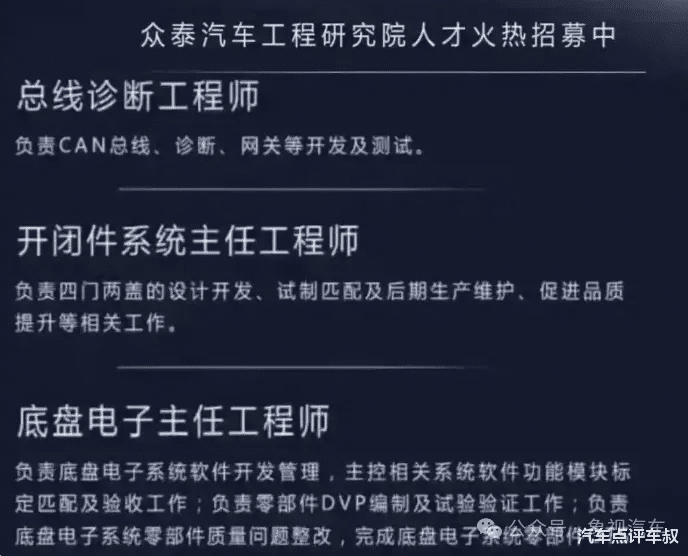 光还钱还不够,众泰还开始招人了。细心的网友发现,众泰汽车工程研究院近期挂出了49个招聘岗位,从整车架构、三电系统到智能网联、芯片开发,覆盖面很广。明显冲着新能源和智能化这两个核心赛道去的。要知道,众泰已经沉寂了太久,技术团队的流失是必然的,这时候大张旗鼓地招兵买马,说明他们至少在纸面上,已经规划好了未来的产品方向。这一连串的操作——拿钱、还债、招人,环环相扣,看得出来,众泰这次是想玩点真的,而不仅仅是停留在口头上“画饼”。