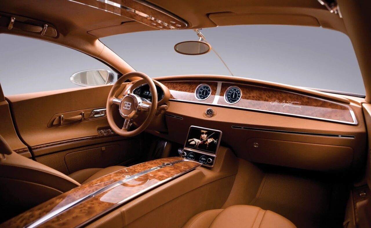 内饰更是将奢华推向极端:大面积布加迪专属皮革、抛光实木、亮铝装饰,最夸张的是仪表台内嵌入一块可拆卸的帕玛强尼陀飞轮腕表,价值10万美元,既可当车载时钟,也能拆下来戴在手上。