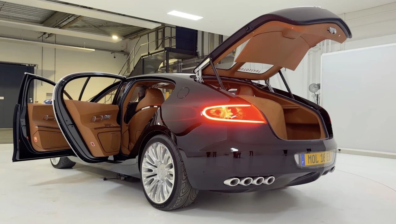 为了实现这个目标,布加迪直接搬出看家本领:前置8.0L W16发动机。这台机器源自威龙,但调校思路完全不同——威龙用四涡轮,Galibier改为双机械增压,并采用序列式工作模式,目的是提升低扭输出,更适合豪华轿车的舒适与从容驾驶。即便如此,这台机器依旧能爆发986马力(公制1000马力),八出排气分两组四出排列在车尾,声浪场面堪称恐怖。
