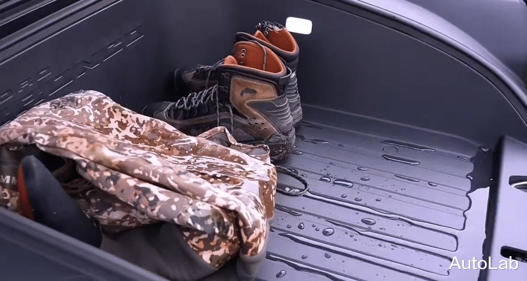 智趣烈马160L的大尺寸前备厢底下开了排水孔,能放下湿漉漉的全套钓鱼装备;