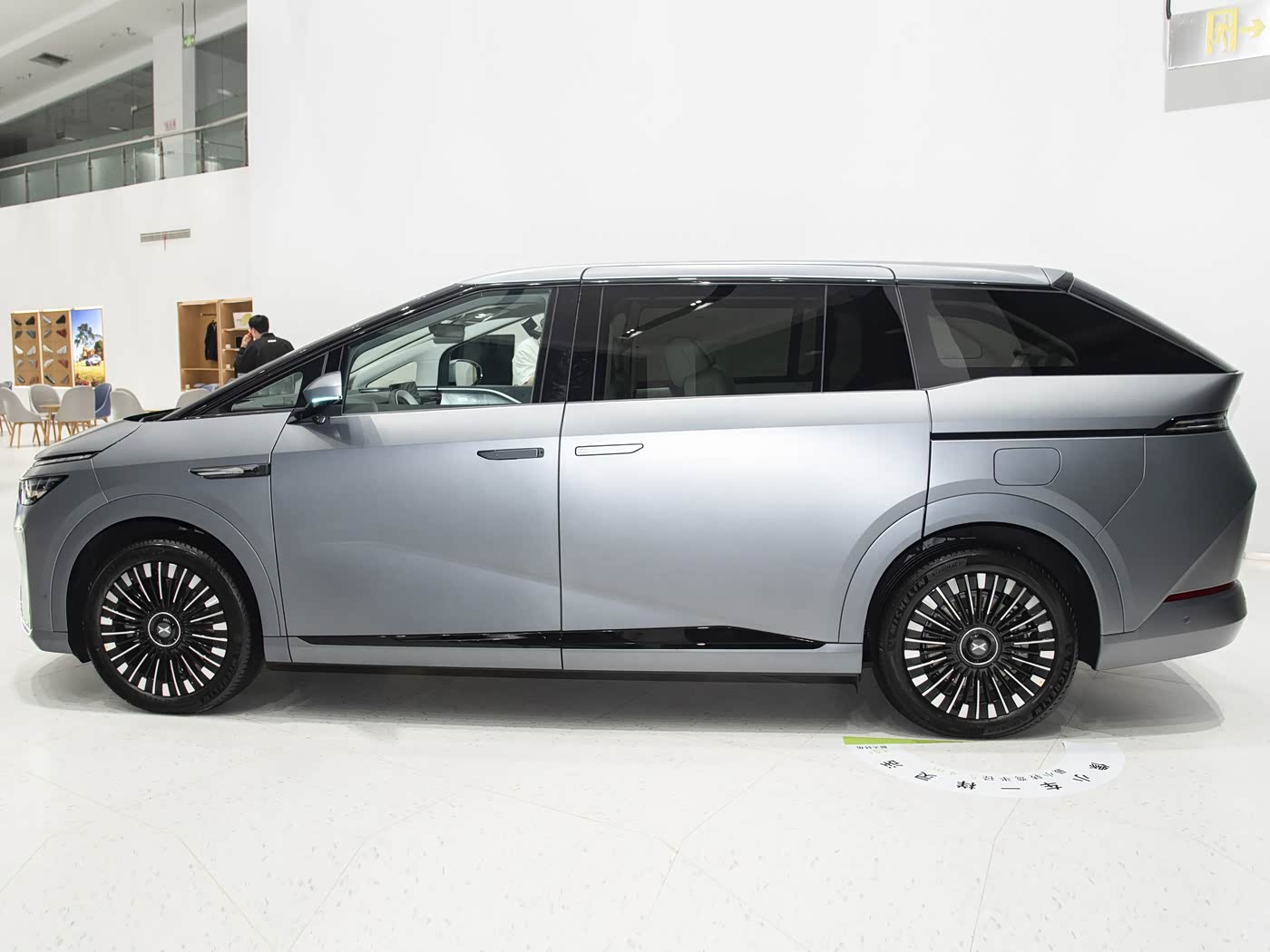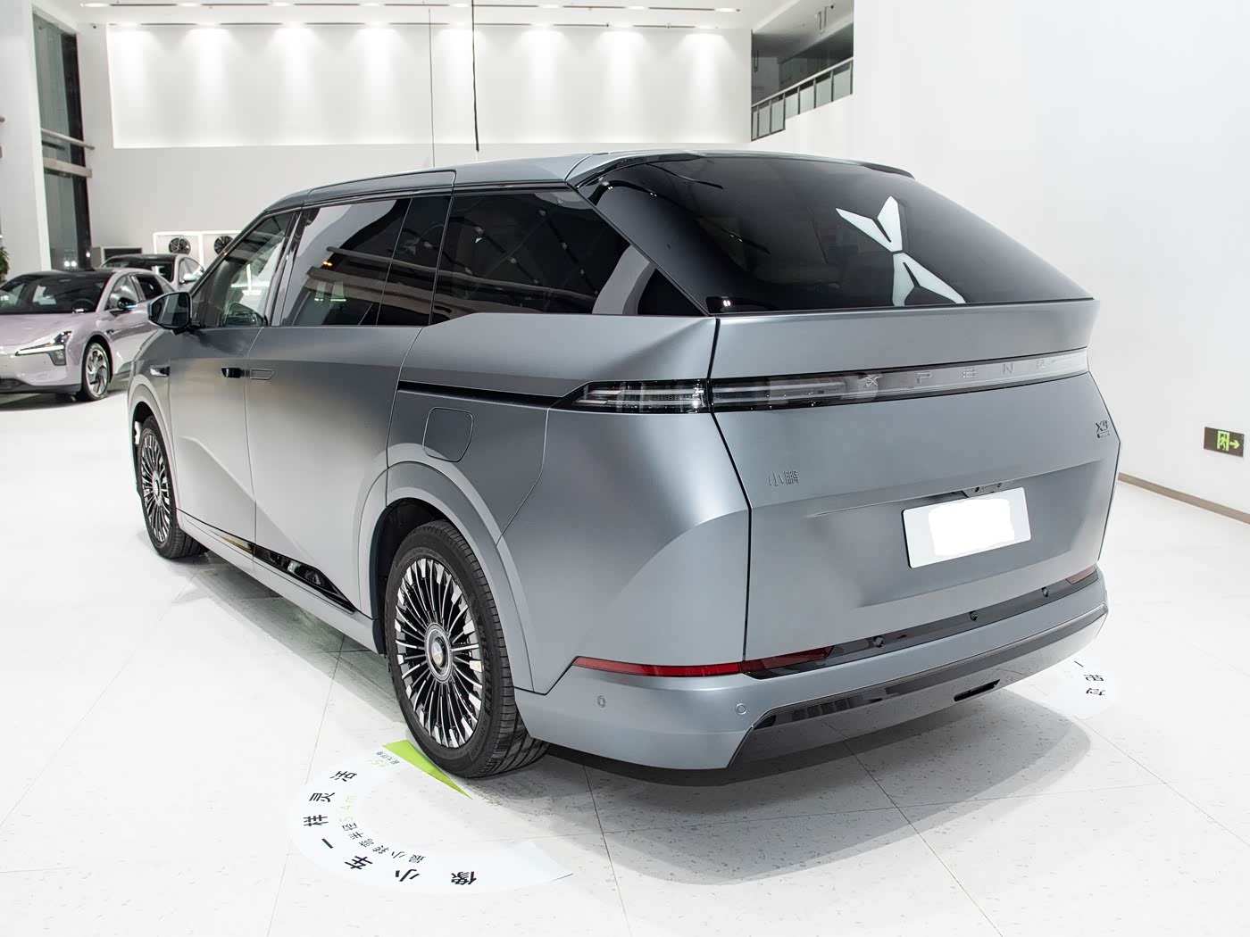 再来看车身侧面部分,小鹏X9彻底摒弃了传统MPV的“方盒子”形态,以溜背式设计塑造出极具动感的轮廓。5316mm的车身长度与3160mm的超长轴距,既保证了内部空间的充裕,又通过流畅的线条化解了大型MPV的笨重感。贯穿式腰线从前翼子板一直延伸至车尾,配合车门下方的折线设计,不仅营造出丰富的光影层次,更进一步优化了空气动力学性能。隐藏式门把手与电动侧滑门的组合,兼顾了科技感与实用性。悬浮式车顶与熏黑的A、B、C、D柱形成鲜明对比,配合大尺寸运动轮毂,将年轻化风格贯彻到底。