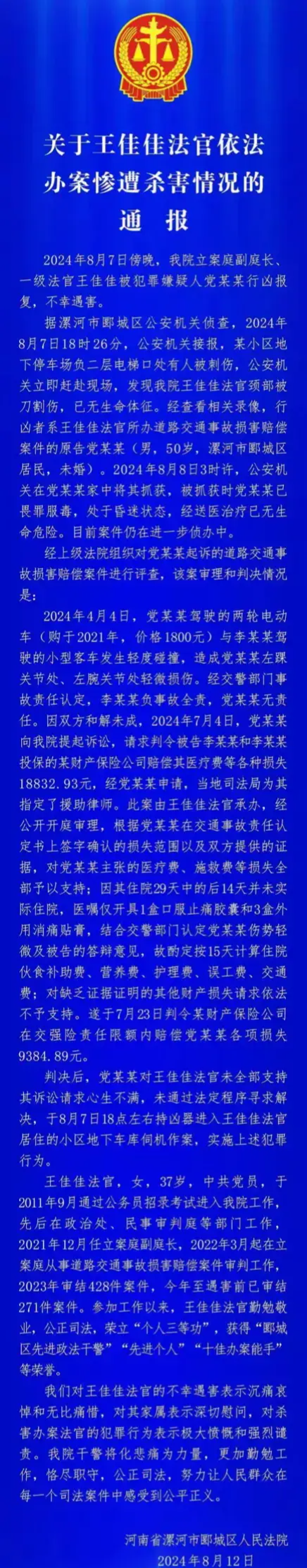 根据报道,8月7日傍晚,嫌疑人党某某因对王佳佳在一起交通事故纠纷中的判决结果不满,选择了极端的报复手段。