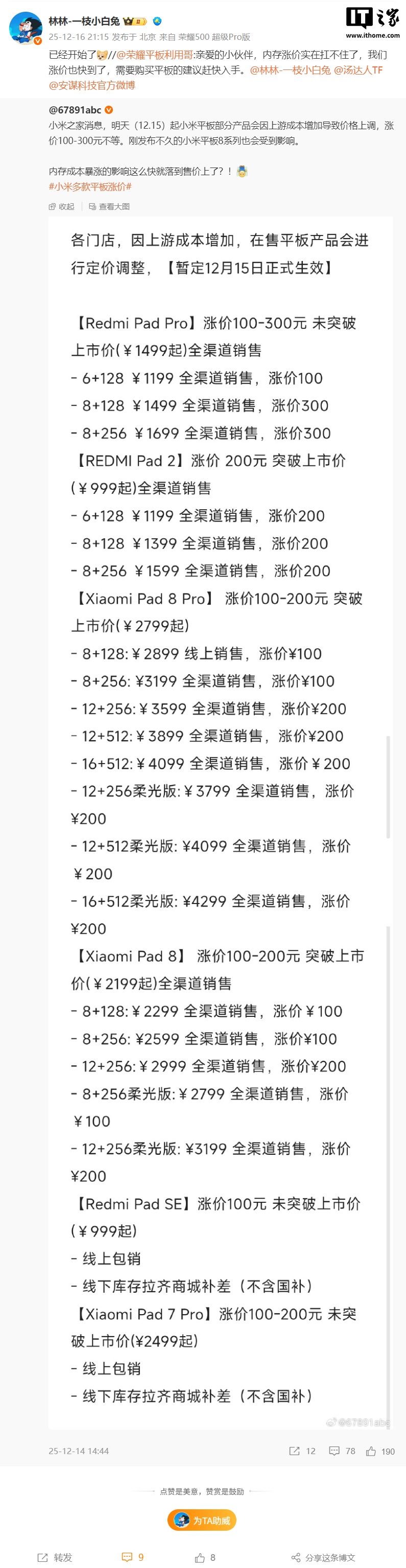 IT之家12月16日消息,由于近期内存涨价,全球终端产品面临艰巨的成本考验,博主@数码闲聊站昨日爆料称,小米部分在售平板已涨价,涨幅100-300。其它厂商也会有已发售中端机涨价,涨幅差不多也是100-300,供应链内存涨价影响最大的就是这些中端机,2026有些中端线新机也要取消1TB版本。