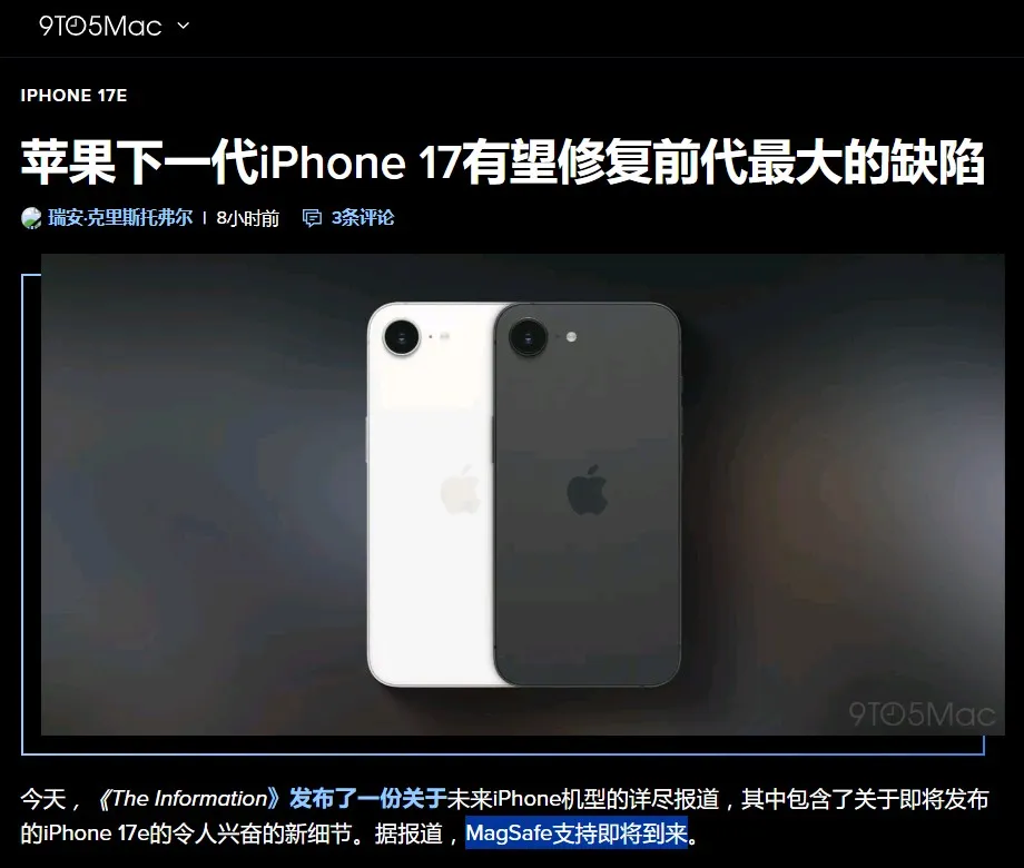 不过,据外媒The Information的报道,明年春季即将推出的新一代iPhone 17e中,将重新加入MagSafe功能,带来更快的无线充电速度。